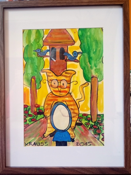 Obraz pt " kot na motorze " został namalowany na papierze farbami akryle o 32 x 36 cm oprawamie